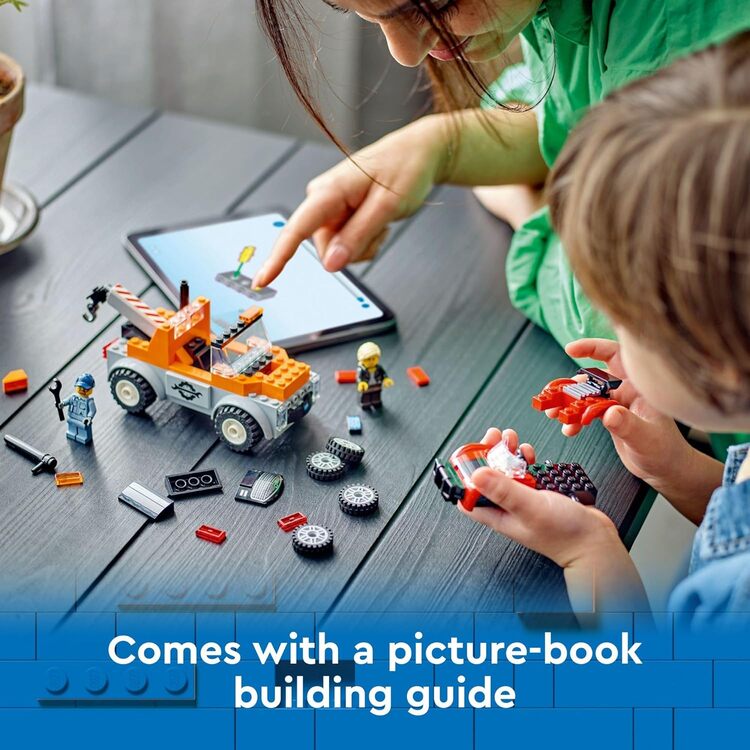 Toy tow truck playset for ages 4+ – Join your little hero for fun adventures with the LEGO® City Tow Truck and Sports Car Repair playset for imaginative storytelling What’s in the box? – This toy vehicle recovery playset set includes everythingkids need to build a tow truck, sports car and truck driver and motorist minifigures Let imagination take the wheel – Pop the drivers into the LEGO® car and recovery truck for hours of imaginative play and creative storytelling LEGO® minifigure accessories – This toy vehicle recovery playset comes with accessories for pretend play, including a toy wrench and phone A fun holiday or birthday gift for kids – Give this LEGO® building toy as a gift for boys and girls aged 4 and up More sets to discover – Kids unleash more fun and adventures when they add this set to others (sold separately) from the LEGO® City range Make learning fun – LEGO® City building toys help kids develop confidence and key life skills through open-ended creative play Dimensions – The tow truck in this 101-piece LEGO® City set measures over 3 in. (7 cm) high, 6.5 in. (16 cm) long and 2.5 in. (7 cm) wide Ages 4+